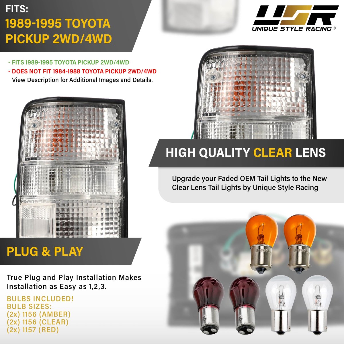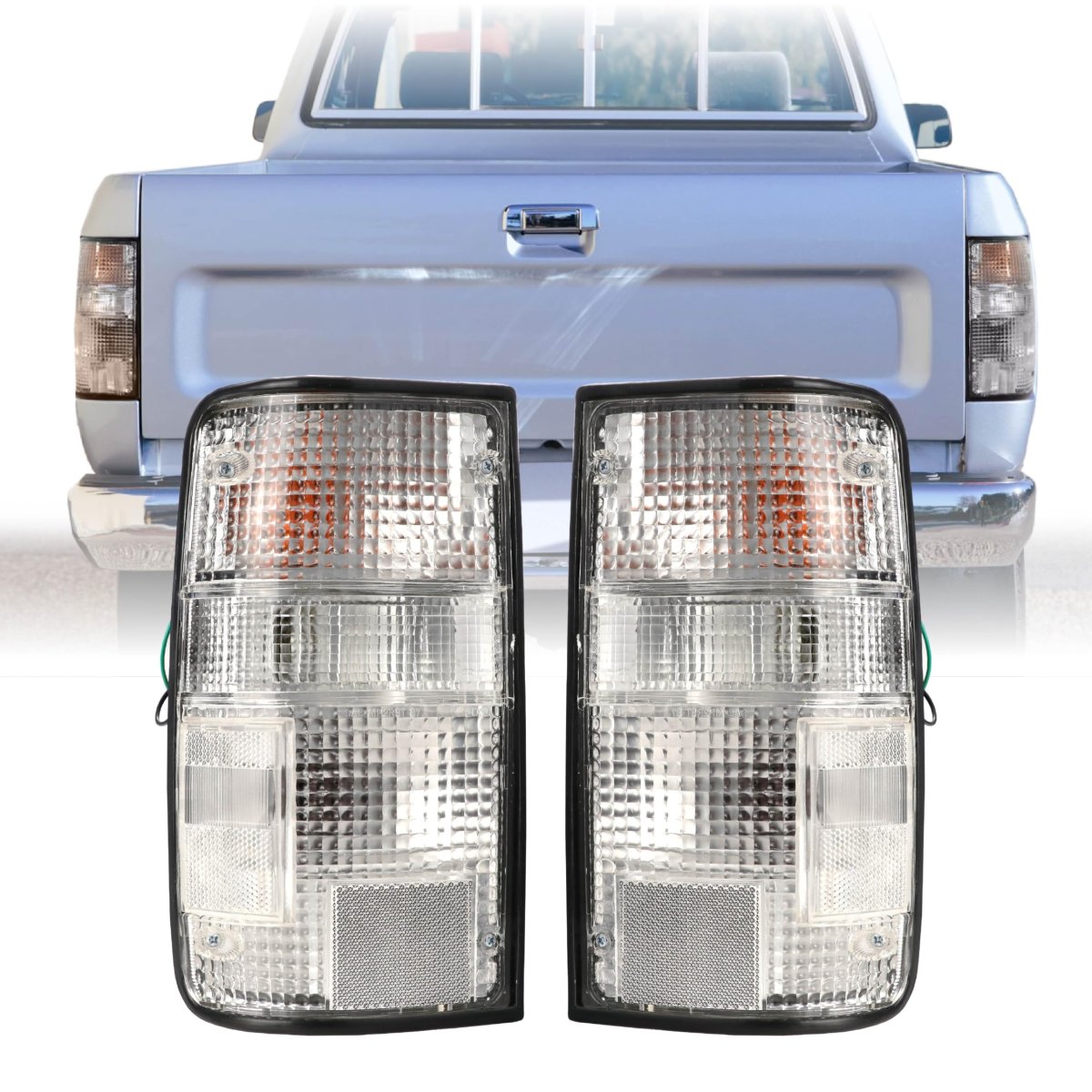CLEAR FROSTED LENS TAIL LAMPS Time to update your old, faded or even damaged stock Lights with These Clear Lens Rear Taillights Set of 2 Pieces. Perfect 89-95 Pick-Up Truck Accessories to Upgrade and a great gift Idea or Replacement Part. Compatible with 1989-1995 Toyota Pick-Up 2WD & 4WD Trucks All Models / Trims such as Standard, Deluxe, SR5 - RN101, 22R-E for 2 Wheel Drive models and VZV85, VZN100 for 4 Wheel Drive models.. OEM FITMENT Manufactured in Taiwan with excellent quality. Molded to fit like stock parts to meet your upgrade and replacement needs. Installation quick and easy. OEM Part Number: (Left) 81560-89166 (Right) 81550-89166.. MATERIAL Lens and housing using top-grade ABS and polycarbonate plastic. Lens offer UV and impact resistance. Housing sealed by manufacturer to offer water resistance.. PLUG AND PLAY READY New set (Left + Right) of Rear Clear Lens Tail Lamps with (x2 1157 Size Red / x2 1156 Size Amber / x2 1156 Size Clear) Incandescent bulbs with Sockets is included, making this a True Plug-n-Play. A Quick and easy DIY install with basic tools. No re-wiring or modifications needed. No Error after install..Other fine products