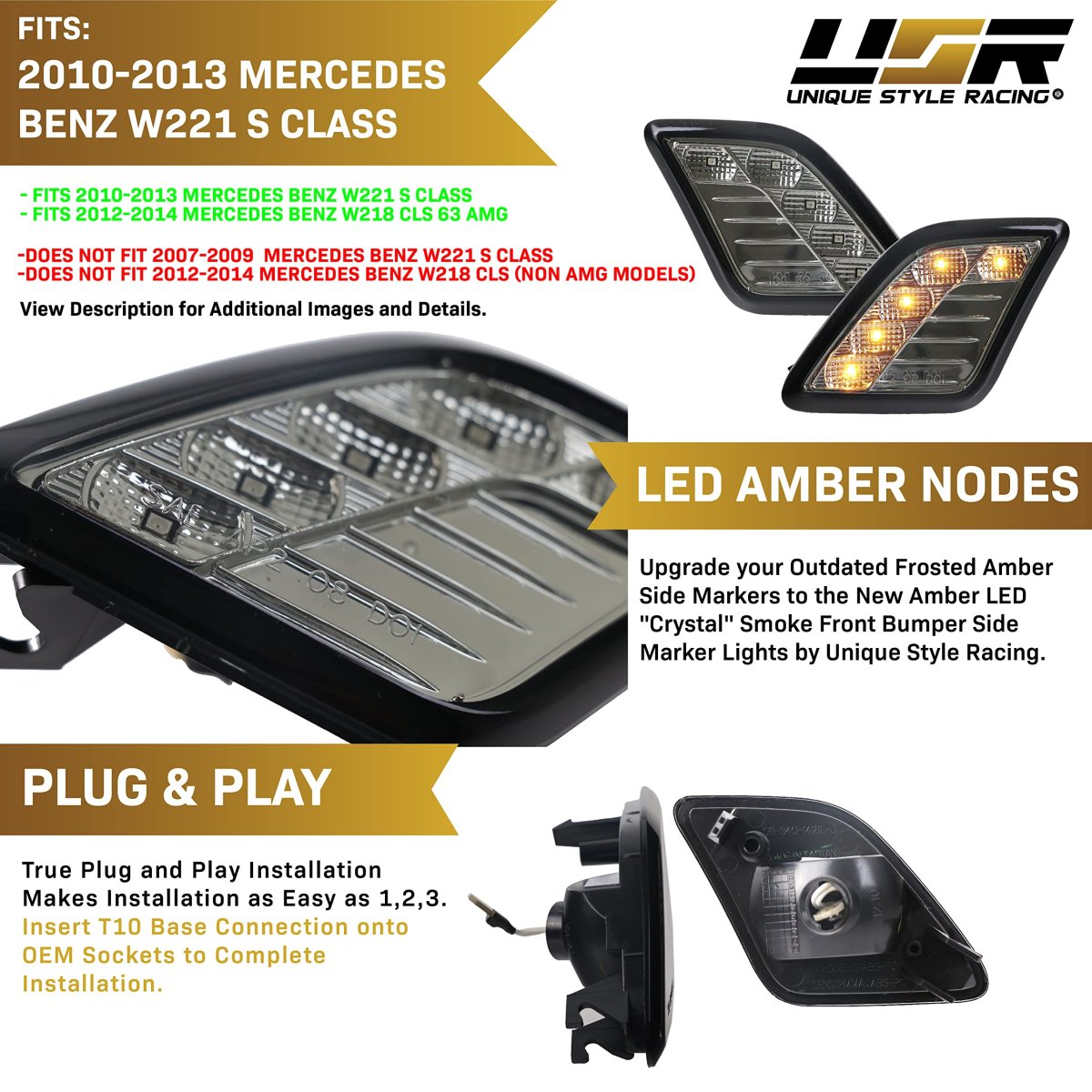 ALL SMOKE CRYSTAL STYLE LENS AMBER LED UPGRADE Time to Upgrade your old, faded, outdated or even damaged stock Amber Lens with this Built in Amber LED Crystal Style Clear Lens. Perfect accessory gift for 2010-2013 W221 S-Class Mercedes Enthusiast!. OEM FITMENT Manufactured in Taiwan with excellent quality. Molded to fit like stock parts to meet your upgrade needs.. MATERIAL Lens and housing using top-grade ABS and polycarbonate plastic. Lens offer UV and impact resistance. Housing sealed by manufacturer to offer water resistance.. PLUG N PLAY READY - EVERYTHING INCLUDED Built in Amber LEDs, just transfer stock sockets to complete installation. Quick and easy DIY install with basic tools. No re-wiring or modifications needed..Other fine products