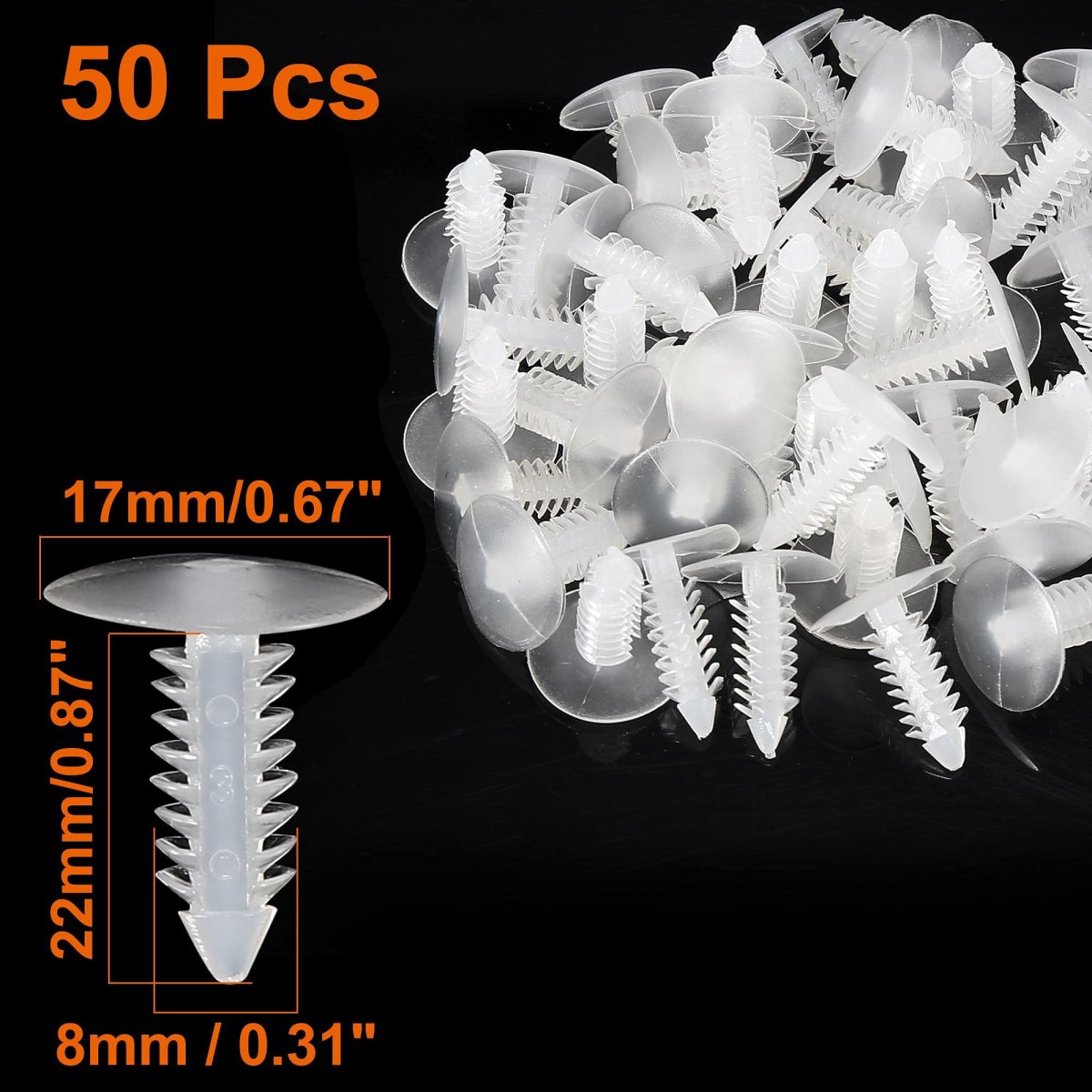 Size: 23 x 17mm/0.91" x 0.67"(L*Max.D); Color: Clear; Product Name: Clips/Rivets/Fastener. Interchange Part Number: Under Engine Splash Guard Rivet Fastener Clips; Manufacturer Part Number: Plastic Push-Type Bumper Retainer Clip; Other Part Number: Screw Body Door Trim Panel Hood. Applications1: Door Card Interior Weatherstrip; Applications2: NYLON CHRISTMAS TREE Carpet Floor Mat Clips; Material: Plastic. Package Content: 50(+/-2%) x Plastic Rivets; Fit Hole Size: 7.5mm/0.30"; Head Diameter(max.): 17mm/0.67"; Stem Diameter: 8mm /0.31". Stem Length: 22mm/0.87"; Total Length: 23mm/0.91".Other fine products