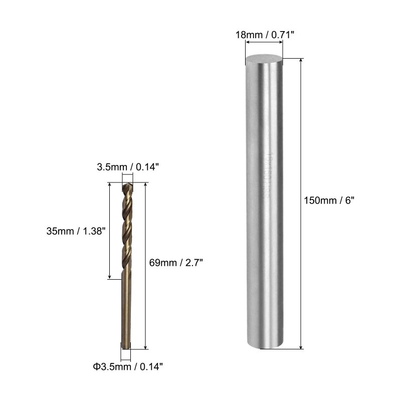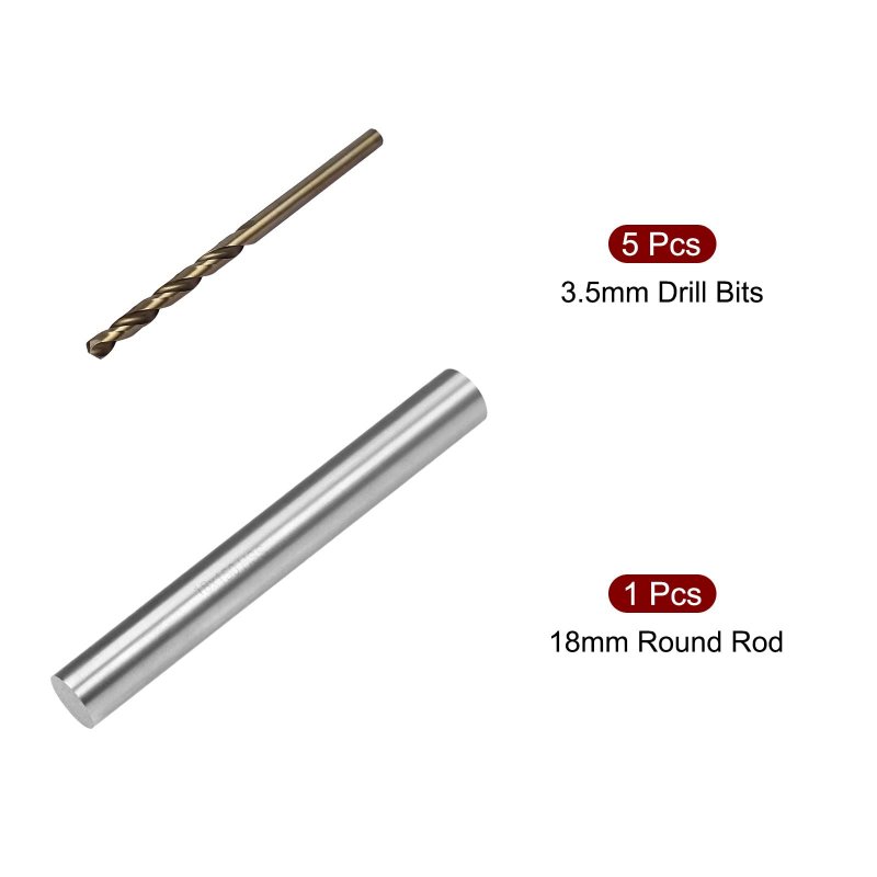 Drill Bit Set: Drill bits: cutting edge diameter: 3.5mm / 0.14"; total length: 69mm / 2.7". Round rod: diameter: 18mm / 0.71", diameter accuracy: +/-0.008mm / 0.0003"; length: 150mm / 6". Package included: 5pcs x 3.5mm drill bits, 1pcs x 18mm round rod. Applications of Bit: Widely used for drilling stainless steel, aluminum alloy, iron, copper, wood and plastic. Suitable lubricant is conducive to cutting or cooling. Sharp spiral flutes provide neat and smooth cuts.. Applications of Rod: Widely used for processing milling cutters, sharp knives, gravers, punch press needles, bearings sleeve rods of machine tools, high hard ejector rods and center pins. The surface is smooth, easy to shape, no cracks formed.. Features: Sharp spiral flutes provide neat and smooth cuts. Spiral groove facilitates the export of metal chip, saving time and effort in operation. Steel Rods can be easy to cut and formed into replacement parts for almost anything..Other fine products