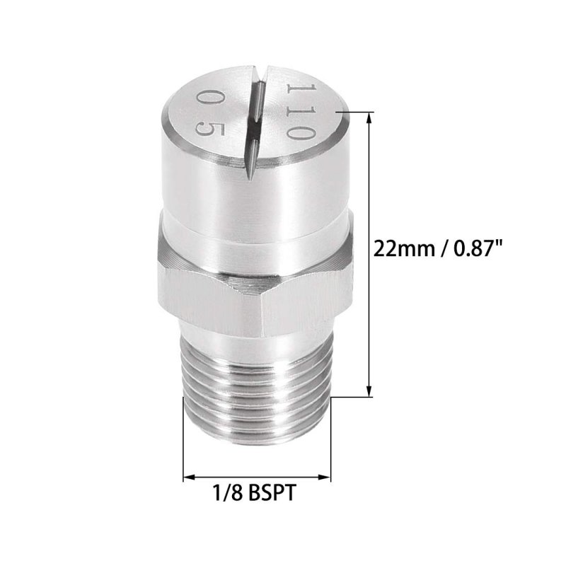 [TECHNICAL PARAMETERS] - 1/8BSPT male thread fitting, orifice diameter is 1.4mm, spray angle is 110 degree.. [TOTAL SIZE] - 0.47" (12mm) hex width, 0.87" (22mm) long.. [MATERIAL] - Made of 304 stainless steel, rust resistance and durable to use.. [FEATURE] - Flat fan spray pattern with even spray distribution and medium droplet size.. [WIDELY USED] - Suitable for cleaning, watering, lubrication, cooling, humidification,etc..Other fine products