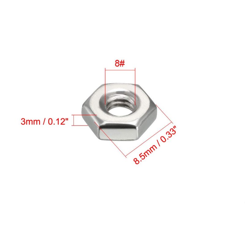 [THREADED] - 0.164" inside diameter, 32 threads per inch.. [SIZE] -0.33" (8.5mm) width across flat, 0.12" (3mm) height.. [MATERIAL] - Made of stainless steel 304, is superior to regular steel and provides excellent rust resistance.. [USED WITH] - Screws onto a bolt, cap screw or threaded rod of the same thread size.. [GREAT REPLACEMENT] - Great replacement for industrial and construction fasteners,also can be a important accessories in your daily life..Other fine products