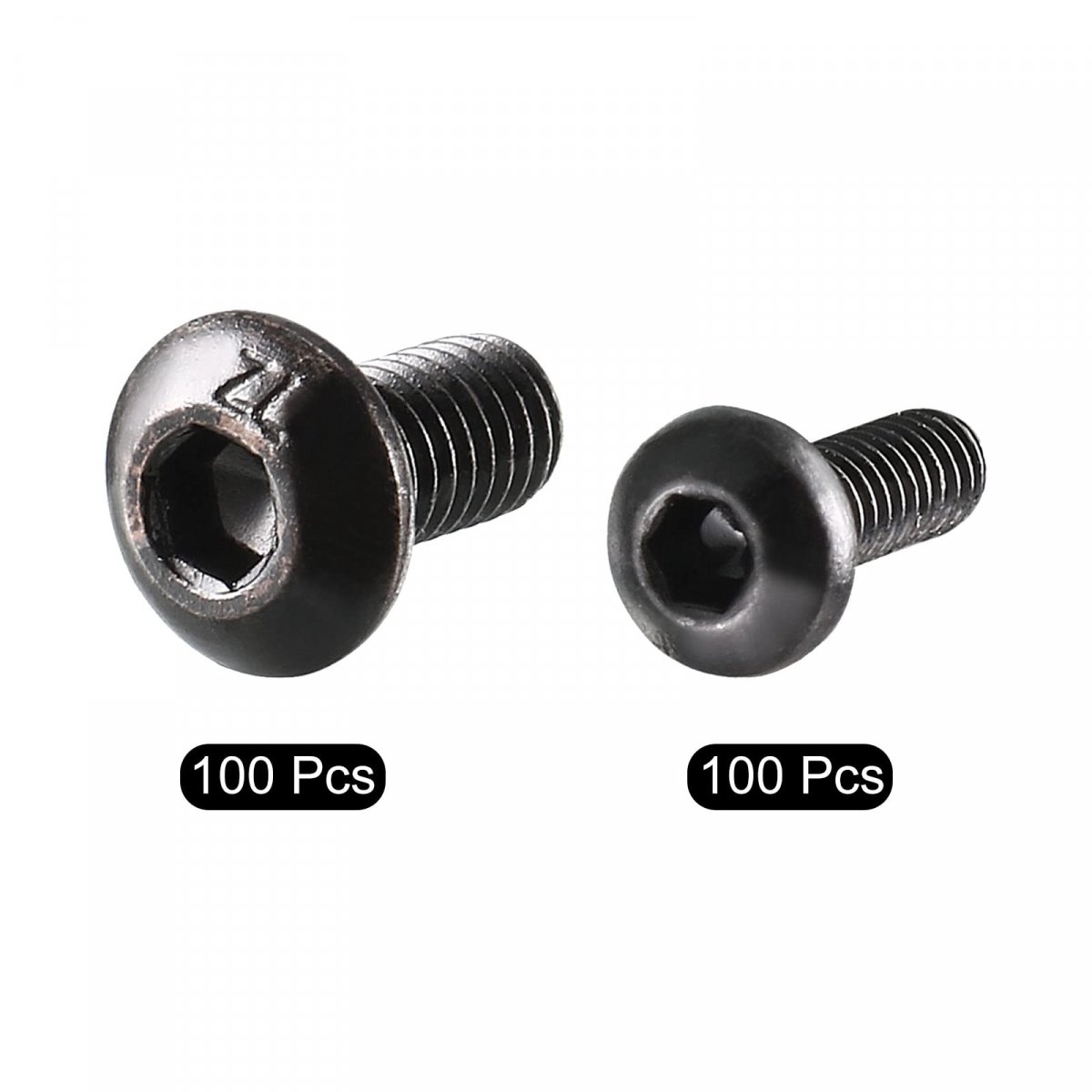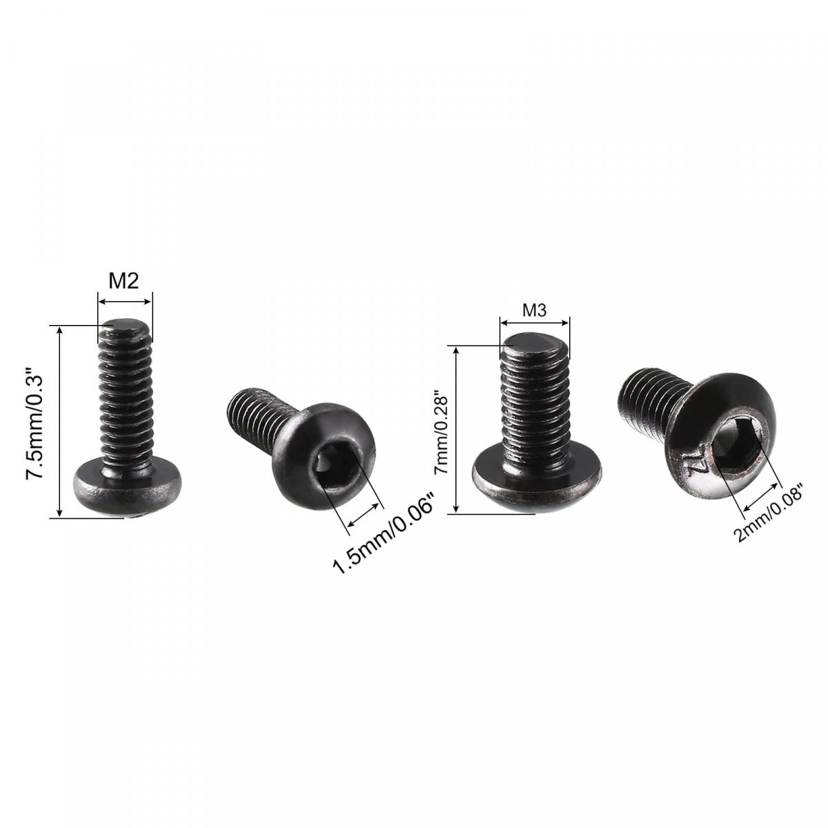Product Name 1: Thread Size: M2x6mm/0.08"x0.24"(D*L); Thread Pitch: 0.4mm; Total Length: 7.5mm/0.3"; Head Diameter: 4mm/0.16"; Hex Socket Width: 1.5mm/0.06"; Head Height(Approx): 1.5mm/0.06". Product Name 2: Thread Size: M3x6mm/0.12"x0.24"(D*L); Thread Pitch: 0.5mm; Total Length: 7mm/0.28"; Head Diameter: 5.5mm/0.22"; Hex Socket Width: 2mm/0.08"; Head Height(Approx): 1mm/0.04". Drive Type: Hex Socket; Head Style: Socket Button Head; Material: 10.9 Alloy Steel; Main Color: Black. Application: Wind power industry, the aerospace industry, office equipment industry, petrochemical industry, electronics industry, communications industry, shipbuilding industry, machinery, furniture, beds, chairs, etc.. Package Content: 100pcs x M2x6mm, 100pcs x M3x6mm Button Head Screws.Other fine products
