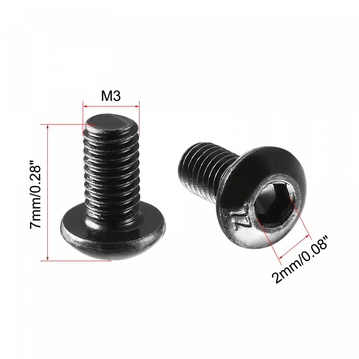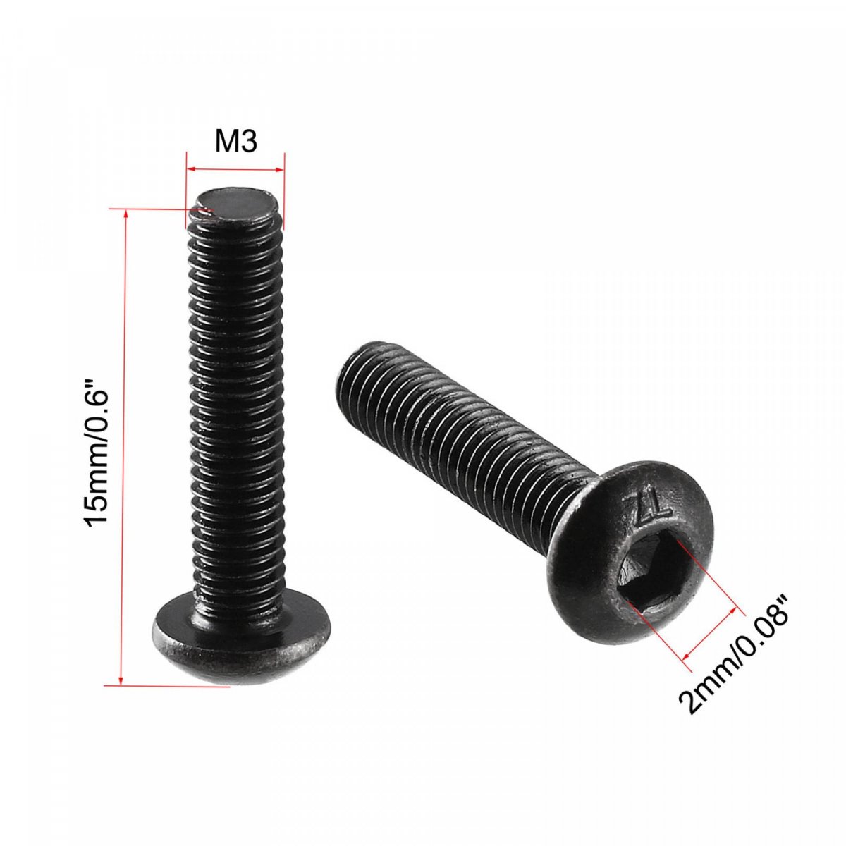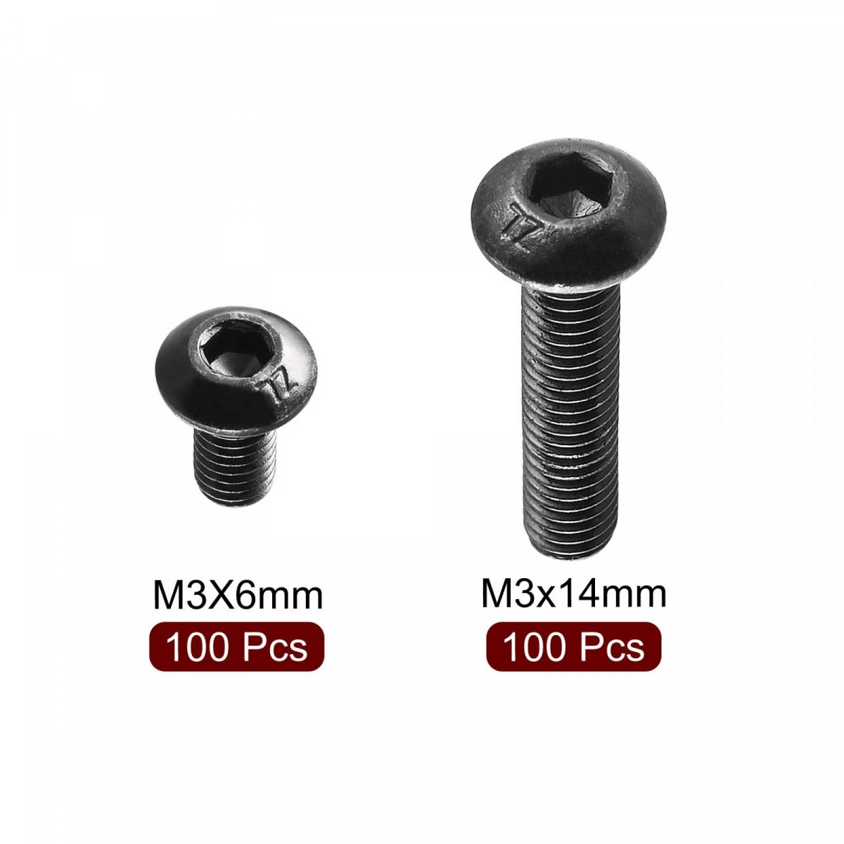 Drive Type: Hex Socket; Head Style: Socket Button Head; Material: 10.9 Alloy Steel. M3x14mm: Package Content: 100(+/-2%)pcs x Button Head Screws; Product Name: Button Head Screws; Thread Size: (Male)M3x14mm/0.12"x0.55"(D*L). M3x14mm: Thread Pitch: 0.5mm; Total Length: 15mm/0.6"; Head Diameter: 5.5mm/0.22"; Hex Socket Width: 2mm/0.08"; Head Height(Approx): 1.5mm/0.06". M3x6mm: Package Content: 100(+/-2%)pcs x Button Head Screws; Product Name: Button Head Screws; Thread Size: (Male)M3x6mm/0.12"x0.24"(D*L). M3x6mm: Thread Pitch: 0.5mm; Total Length: 7mm/0.28"; Head Diameter: 5.5mm/0.22"; Hex Socket Width: 2mm/0.08"; Head Height(Approx): 1mm/0.04".Other fine products