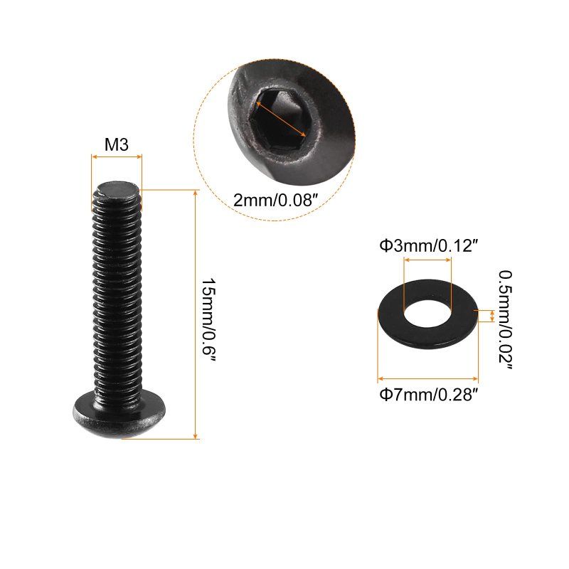 Product Name 1: Thread Size: M3x14mm/0.12"x0.55"(D*L); Thread Pitch: 0.5mm; Total Length: 15mm/0.6"; Head Diameter: 5.5mm/0.22"; Hex Socket Width: 2mm/0.08"; Head Height(Approx): 1.5mm/0.06". Product Name 2: Flat Washer; Material: Iron; Thickness: 0.5mm / 0.02"; Inner Diameter: 3mm / 0.12"; Outer Diameter: 7mm / 0.28"; Standard: M3; Coating: Black Zinc Plated. The flat washer provides a bearing surface for fastener load distribution or is used as a spacer between components; Intended for general use under the head of a bolt or nut in order to provide a smooth-bearing surface.. Wind power industry, the aerospace industry, office equipment industry, petrochemical industry, electronics industry, communications industry, shipbuilding industry, machinery, furniture, beds, chairs, etc.. Package Content: 100pcs x Button Head Screws; 300pcs x Flat Washer.Other fine products