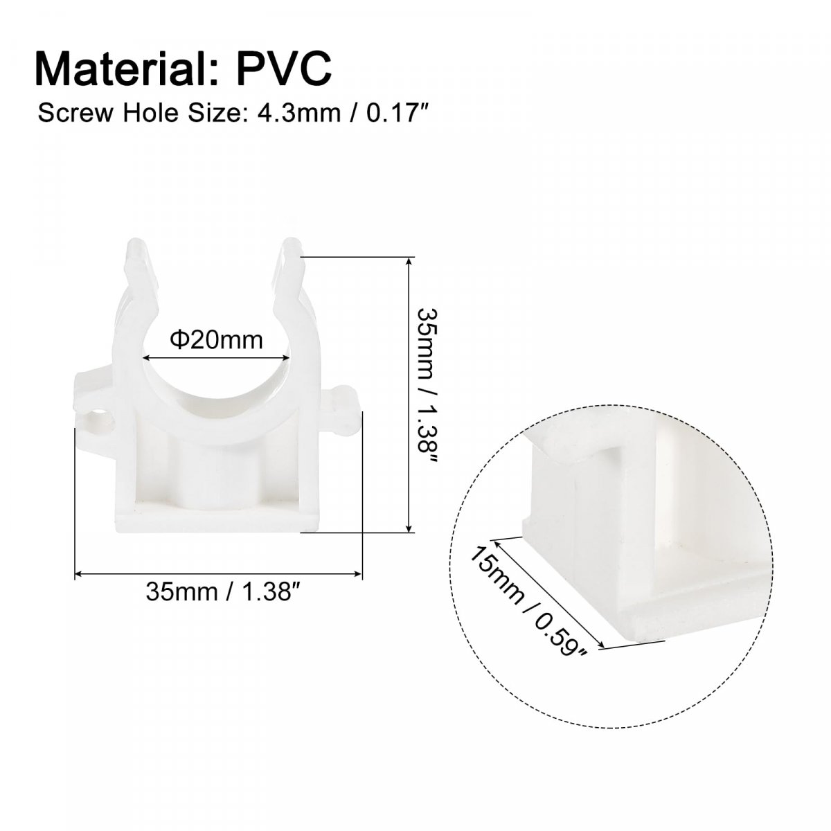 Fit Pipe OD: 20mm / 0.79"; Overall Size: 35 x 15 x 35mm / 1.38" x 0.59" x 1.38"(L*W*H); Screw Hole Size: 4.3mm / 0.17"; Package Content: 10pcs x U-Shaped PVC Water Pipe Clamps(Not including mounting screws). Material: The pipe clip is made of PVC material, tight structure, good toughness, high strength, good fixing and protection effect on the pipeline, and long service life.. Advantages: With a buckle design, can be combined with other buckles of the same style freely, increasing flexibility.. Installation: Draw a line on the installation position in advance, mark the position of the pipe clamp, fix the pipe clamp with screws, and then clamp the pipe in to complete the installation. The package does not contain mounting screws.. Application: U-shaped PVC pipe clamp is widely used in the laying and installation of water pipes, hoses, tubing, PEX pipes, PVC pipes, etc..Other fine products