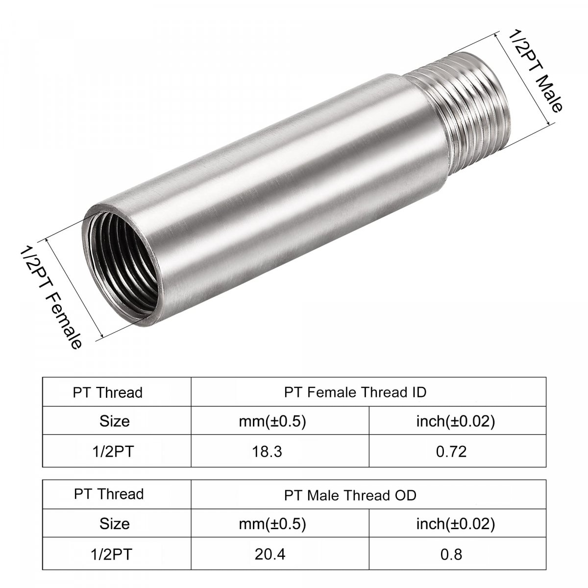 Male Thread Size: 1/2PT(Approx OD 20.4mm); Female Thread Size: 1/2PT(Approx ID 18.3mm).. Made of 304 stainless steel, sturdy and durable, corrosion resistance, not easy to rust, with high strength to support your shower head.. Used for connecting and extending shower arm, perfect shower adjustment.. The pipe fitting can also be used in the garden, swimming pool, fuel equipment, plumbing, and pneumatic system..Other fine products