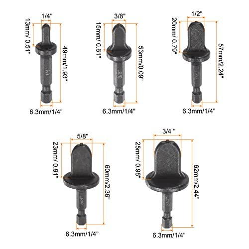 [Feature]: Finish: Black Oxide, Material: Carbon Steel, Size: 1/4", 3/8", 1/2", 5/8", 3/4", Shank type: Hex Handle, Height: 49mm/1.93 inches, 53mm/2.09 inches, 57mm/2.24 inches, 60mm/2.36 inches, 62mm/2.44 inches, Shank diameter: 6.3mm/0.25inch. [Material]: Made of carbon steel with black oxide smooth finish, long service life and easy to use.. [Function]: When air conditioning is installed, expand copper tube, make two copper tube mutual link.. [Easy To Use]: It needs to be used with power tools such as hand electric drill, saving you time and improving work efficiency.. [Heat by Friction]: The hex handle drill expander for molding tubes using heat by friction way more surface of between the flare and the Valve. Arc design preserve the ductility of copper/aluminum during die forging to leak-tight fitting..Other fine products