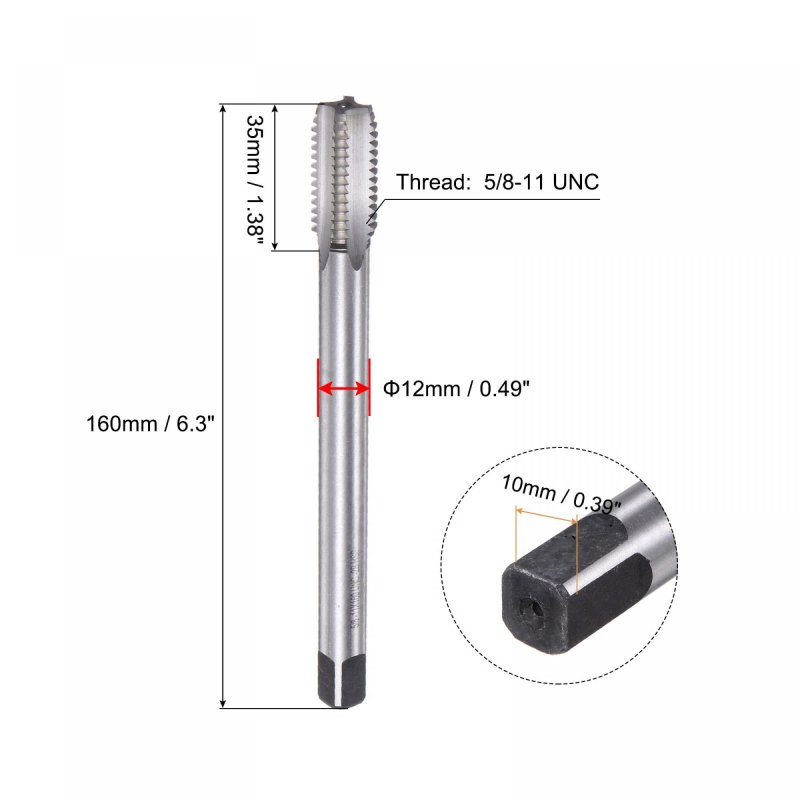 Tap Size: Thread size: 5/8-11 UNC; total length: 160mm / 6.3" (approx.); accuracy class: H2. Straight flute design, downward chip removal. Right hand thread cutting, clear threads, fast tapping with accuracy.. High Speed Steel: High speed steel tool has high hardness and toughness, wear resistance, heat resistance. Features just the base substrate without any coatings, good for general purpose thread tapping.. Applications: Suitable for processing through holes or shallow blind holes . Used for drilling and tapping aluminum, stainless steel, copper, hard plastics, etc.. Use with tapping oil to get higher quality threads and more durable taps.. Easy to Use: Used on drilling machines, tapping machines, CNC and milling machines. Recommended feed rate: general steel: 6-15m/min; harder steel: 5-10m/min; stainless steel: 2-7m/min; cast iron: 8-10m/min..Other fine products