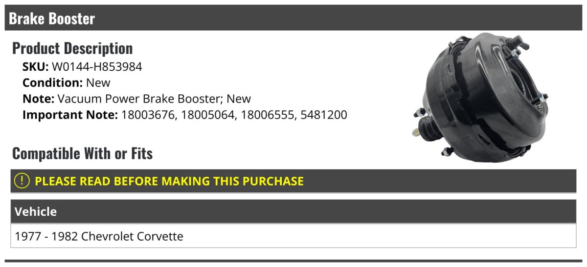 - Vacuum Power Brake Booster For 1977-1982 Chevy Corvette