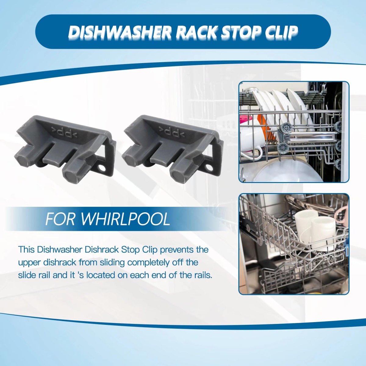 IDEAL REPLACEMENT - This Dishwasher Dishrack Stop Clip for Whirlpool prevents the upper dishrack from sliding completely off the slide rail and it 's located on each end of the rails. Replaces part numbers: W10195622, WPW10195622, WPW10195622VP, AP4566222, PS11750071, AP6016778, 1872168. WIDE APPLICABILITY - This W10195622 Dishwasher Upper Dishrack Slide Rail Stop Clip fits for Whirlpool / Jenn-Air / for Ken-more / KitchenAid Dishwasher, Models begin with 7WDT7, WDF7, WDL78, WDT7, JDB8000, 66513, KDFE45, KUDC1. WIDE APPLICABILITY - Fit for KDFE454CSS0, KUDC10FXBL0, KUDC10FXSS0, KUDC10FXWH0, KUDC10IXBL0, KUDC10IXSS0, KUDC10IXWH0, KUDS30CXWH5, KUDS30FXWH8, KUDL15FXSS7, KUDS30CXWH2, KUDL15FXBL2, KUDS30IBBL1. PREMIUM QUALITY - Made of high-quality material and well-tested by the manufacturer. Meets high standards. Easy to install the part YOURSELF and quickly get your dishwasher back to work within few minutes.Other fine products