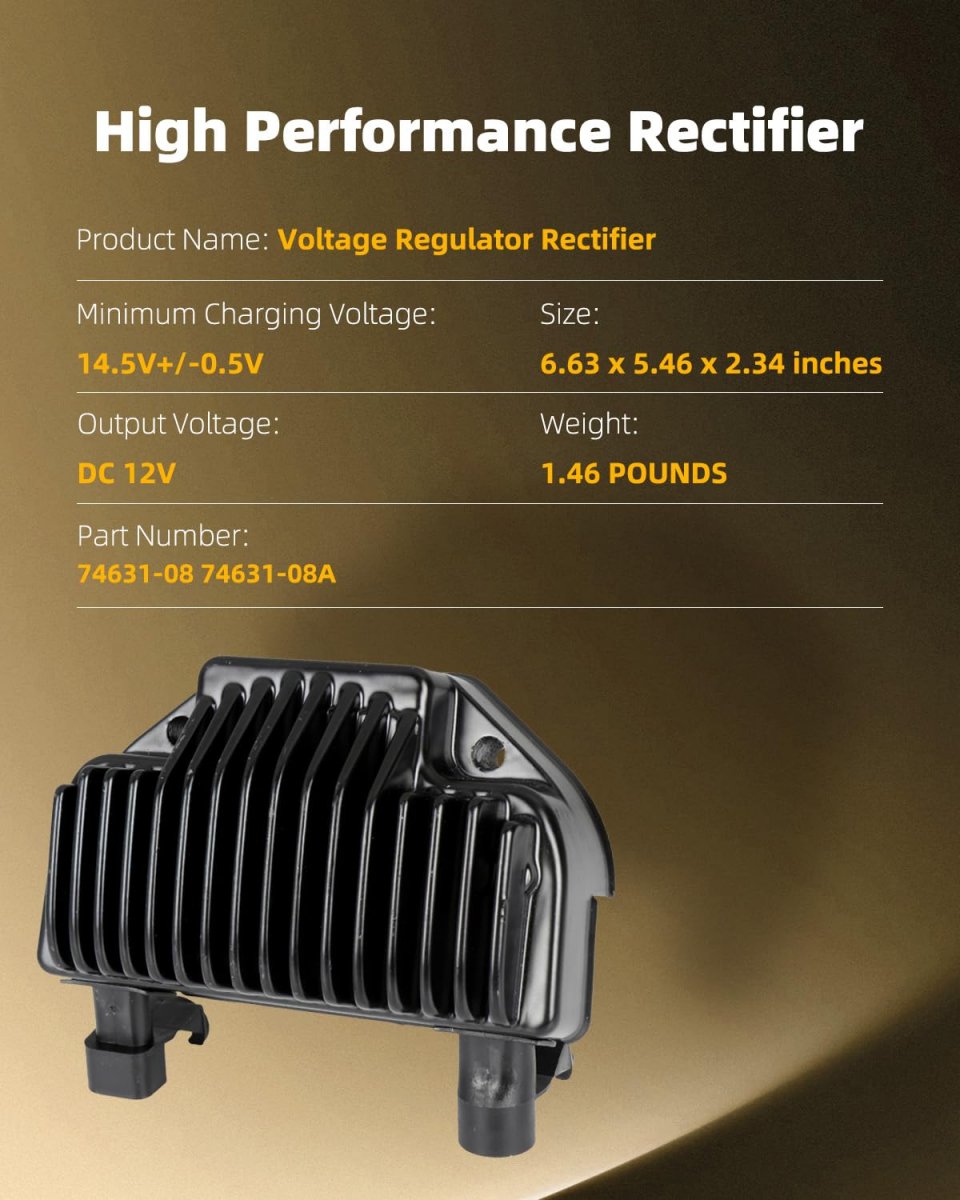 COMPATIBLE MODELS - Voltage Regulator Rectifier Fit for 2012 2013 2014 FLD Switchback 2008 2009 2010 FXD Dyna Super Glide 2008 2009 2010 2011 2012 2013 2014 FXDB Street Bob 2008 2009 2010 2011 2012 2013 2014 FXDC Super Glide Custom 2008 2009 2010 2011 2012 2013 2014 FXDF Fat Bob 2008 2009 FXDL Dyna Low Rider 2008 2010 2011 2012 2013 2014 FXDWG Dyna Wide Glide. PRODUCT DETAILS - Replacement part number: 74631-08 74631-08A. Output Voltage:DC 12V;Minimum Charging Voltage:14.5V+/-0.5V.Fit for motorcycle and boat motors, DIY engines and so on. HIGHLY PERFORMANCE - Replace a new regulator rectifier can raised your lights brightness,improve the phenomenon of low-grade driving,the shift more smoothly,improve the ignition efficiency and make the spark plug burn more fully,prevent over-charging battery etc. WHEN TO REPLACE - When something breaks in your rectifier,you have to replace a new one to maximize battery life and keep your vehicle in good working order.Other fine products