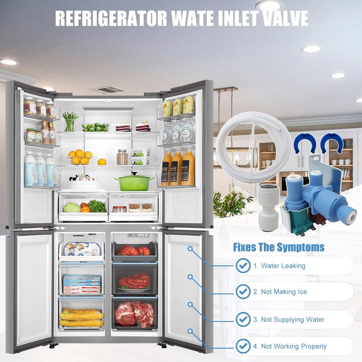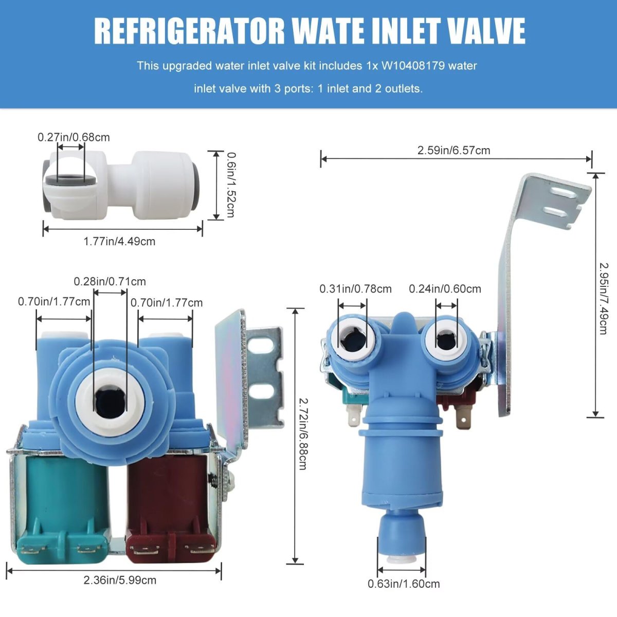 Xspeedonline W10408179 Water Inlet Valve Compatible for Kenmore, Compatible for KitchenAid, Compatible for Maytag Fridge. Replace Part Numbers: IMV708, W10179146, WPW10179146VP, W10408179VP, 2304833, AP526347, WPW10179146, W10155357, W10408179, 1938614, 2186486, 2188622, 2188708, 2188746, 2205762, 2255457, 2304757, 2304833, 2315534, 4389177. Compatible for Whirlpool, for Kenmore, for KitchenAid, for Amana, for IKEA and for Maytag refrigerators. Simplified Installation Process: Featuring standard 1/4-inch flare connections and familiar terminal sizes, this valve is designed for a straightforward installation. Clear instructions are included to help you replace your old valve quickly. Solve Issues: No water from dispenser, No ice, or leaks. It regulates water to your fridges ice maker and dispenser, restoring clean water flow and fast ice production. Specifications: Electrical rating: 120V AC Frequency: 50/60 Hz Power: 35W (Brown solenoid), 20W (Green solenoid). Inlet: 1/4" compression fitting Outlet: 7/16" and 1/2" UNF thread Flow rate: 130 CC/7.5 seconds.Other fine products