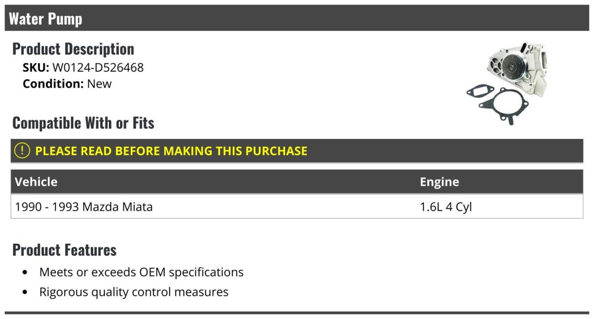 - Water Pump For 1990-1993 Mazda Miata 1 6l 4-cylinder