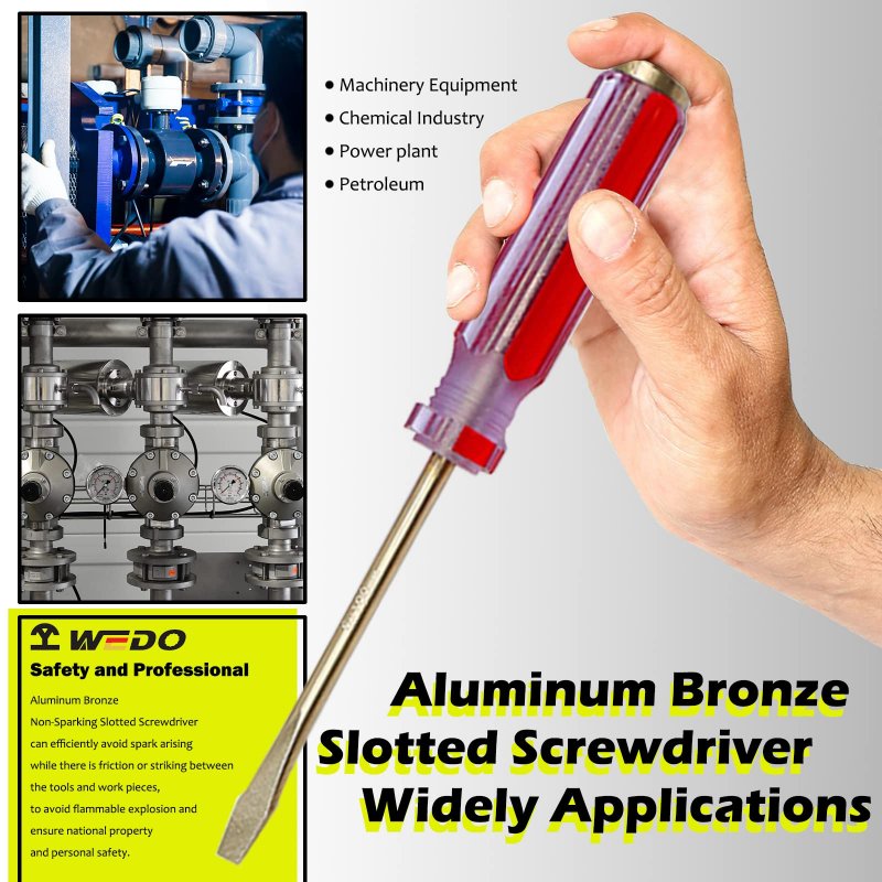 NON-SPARKING SCREWDRIVER: Slotted Screwdriver constructed from Aluminum Bronze or Berylium Bronze with Heat Treated for maximum strength(30HRC-40HRC). Non-sparking screwdriver can efficiently avoid spark arising while there is friction or striking between the tools and work pieces, to avoid flammable explosion and ensure national property and personal safety.. STRIKING CAP: Strike cap of flat head screwdriver to protect handle from hammer blows,the material of strike cap is also made by Aluminum Bronze or Berylium Bronze,transferring the force from the striking cap to the tip while striking.. NON-SLIP HANDLE DESIGN: Ergonomic flat head screwdriver acetate handles provide increased comfort and maximized torque for driving and loosening fasteners.Chemical-resistant acetate handle stands up to all conditions,the handle provides a secure and comfortable grip.. SCREWDRIVER APPLICATONS:Non-sparking screwdriver is widely used in petro-chemical, oil production, gas production, oil and gas pipelines, power generation, mining, plastics, chemical fiber and other industries..Other fine products