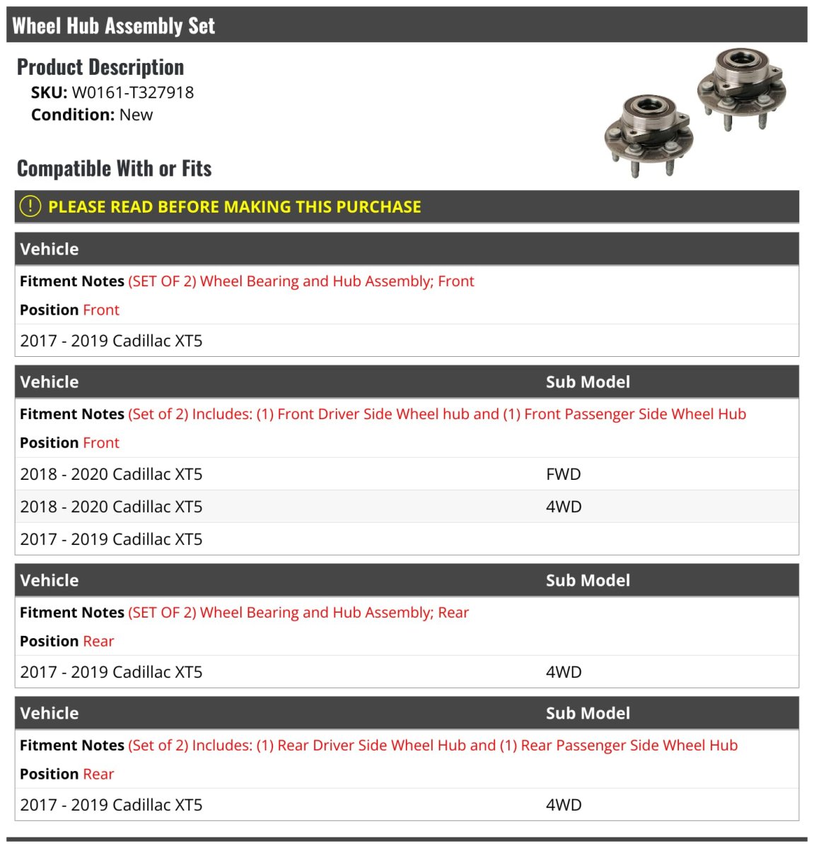 - Wheel Bearing Hub Assembly Set Of 2 Front Or Rear For 2017-2020 Cadillac Xt5 Only Fits Position With 17-19 4wd Models