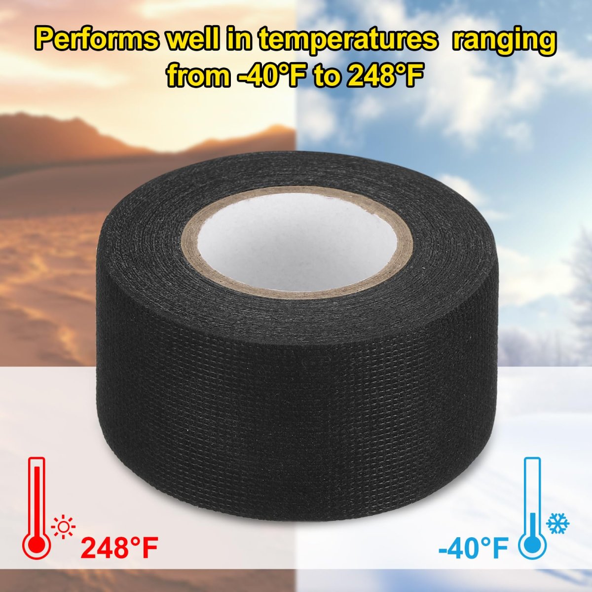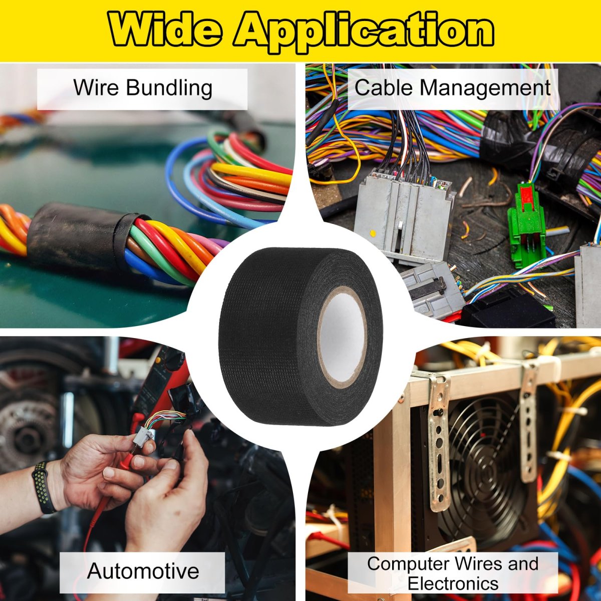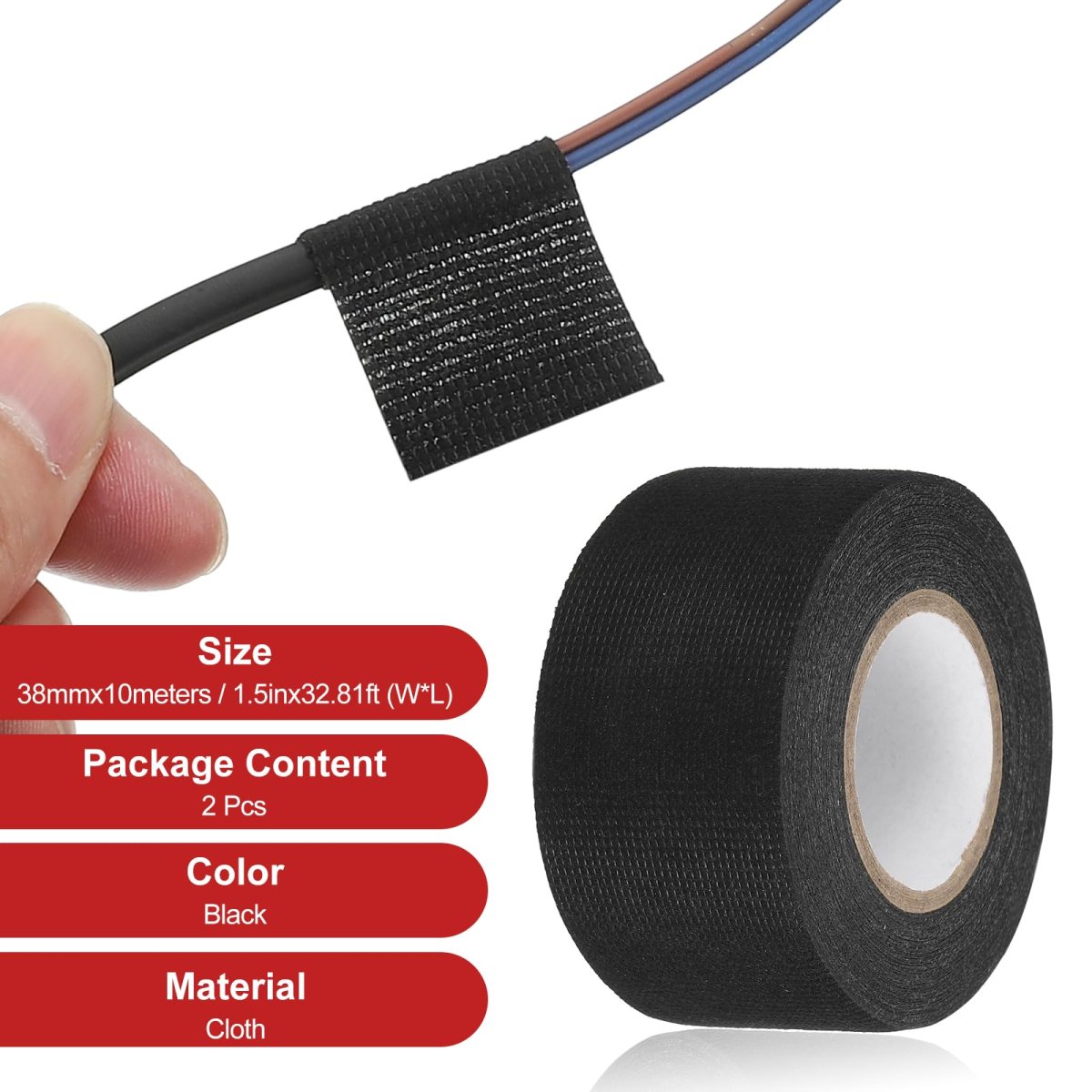[Complete Package] The total size of the harness tape is 38 mm x 10 m / 1.5 in x 32.81 ft (W x L). You will receive 2 pcs of wiring harness tapes, providing long-lasting performance for all your automotive wire insulation needs.. [Superior Flexibility] Crafted from chemical fiber cloth, this cloth electrical tape is both soft and highly flexible, making it perfect for managing wire and electrical cables, automotive interiors, main wire harness wrapping, wire joints, and wire fixing. It also works great for home appliance wiring.. [Durable and Resistant] The automotive cloth tape is designed to resist wear, corrosion, and abrasion, ensuring reliable insulation and protection for your vehicle's wiring. This auto electrical cable fixing tape offers superior sound and rattle dampening, minimizing coil noise. The special design ensures strong adhesion, making it secure and protective for your automotive wiring.. [Temperature Stability] This wire wrapping tape performs well in both hot engine compartments and cold winter conditions in temperatures ranging from -40F to 248F. It adheres strongly but doesnt become a sticky mess when removed.. [Easy Installation] Super stretchy and easy to tear by hand, this fabric electrical tape allows you to reach even the most challenging areas with ease. Its flexibility ensures a secure and clean installation every time..Other fine products