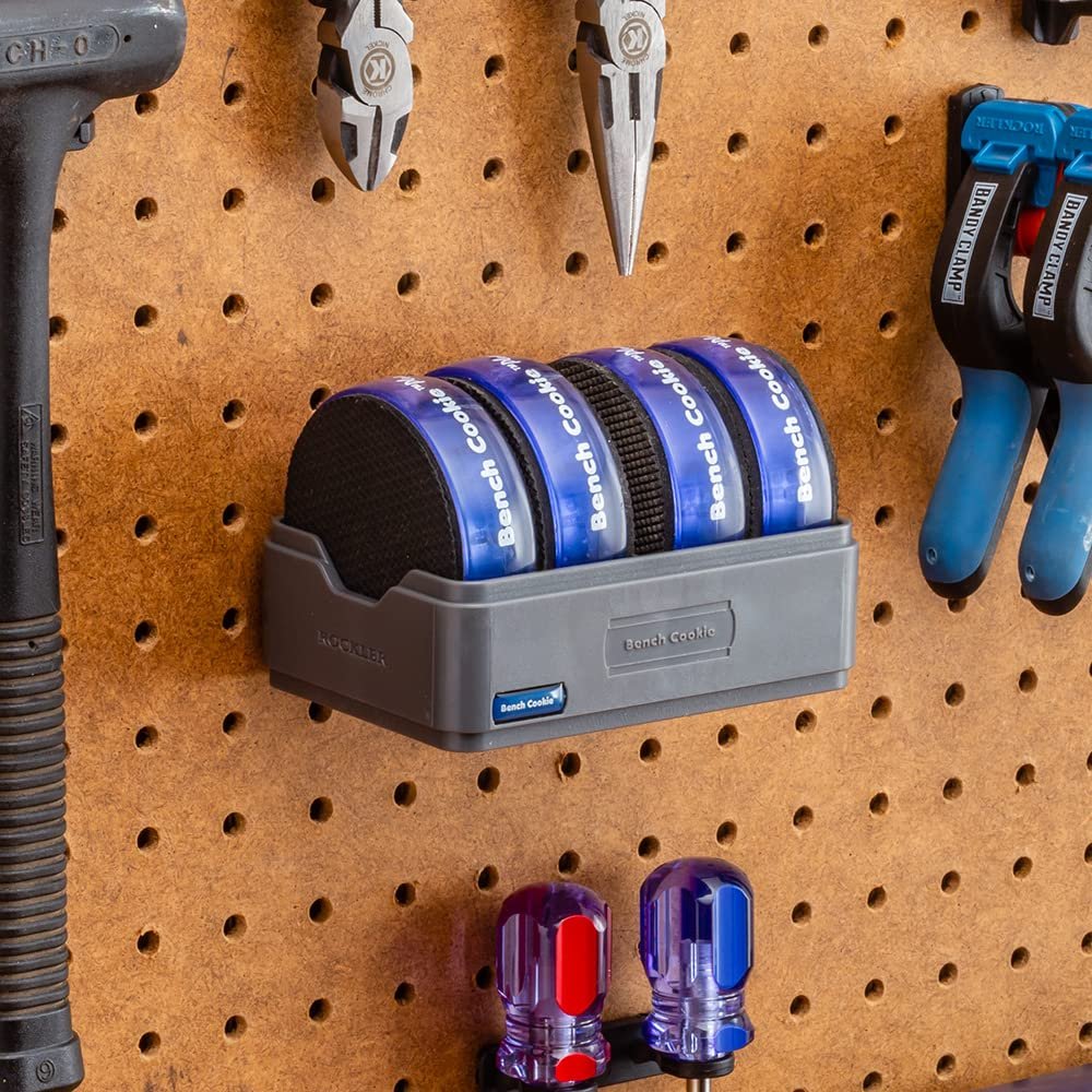 Keep Tools Within Reach: Mount this Rockler bench cookie rack on your wall, bench, or pegboard to keep up to four Bench Cookies in a neat, accessible row; it's designed to make your workspace more organized and efficient. Designed for Convenience: The side notches of the pegboard tool holder allow for quick removal of Bench Cookies, while the open bottom design prevents dust buildup, keeping your tools clean and ready to go. Versatile and Durable: Made with sturdy ABS plastic, this work bench grip rack can handle daily shop use; install it permanently with included steel screws or attach it securely to a pegboard with the wobble-free plastic screws. Streamline Your Workflow: Whether mounted, placed on your workbench, or kept in a drawer, this storage organizer helps you declutter your workspace and ensures your Bench Cookies are always easy to find.Other fine products