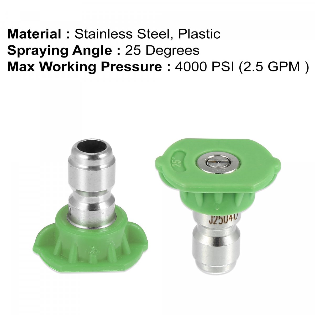 [Suitable] 1/4'' quick connection design, effectively extend the function of your pressure water gun with various kinds of spray angles.. [Spraying Angle] 25 Degrees, Color: Green.. [Max Working Pressure] 4000 PSI (2.5 GPM ).. [Function] Quickly and easily clean hard-to-reach places using less time but great results.. [Durable Material] Made of hard stainless steel and quality plastic with long service life..Other fine products