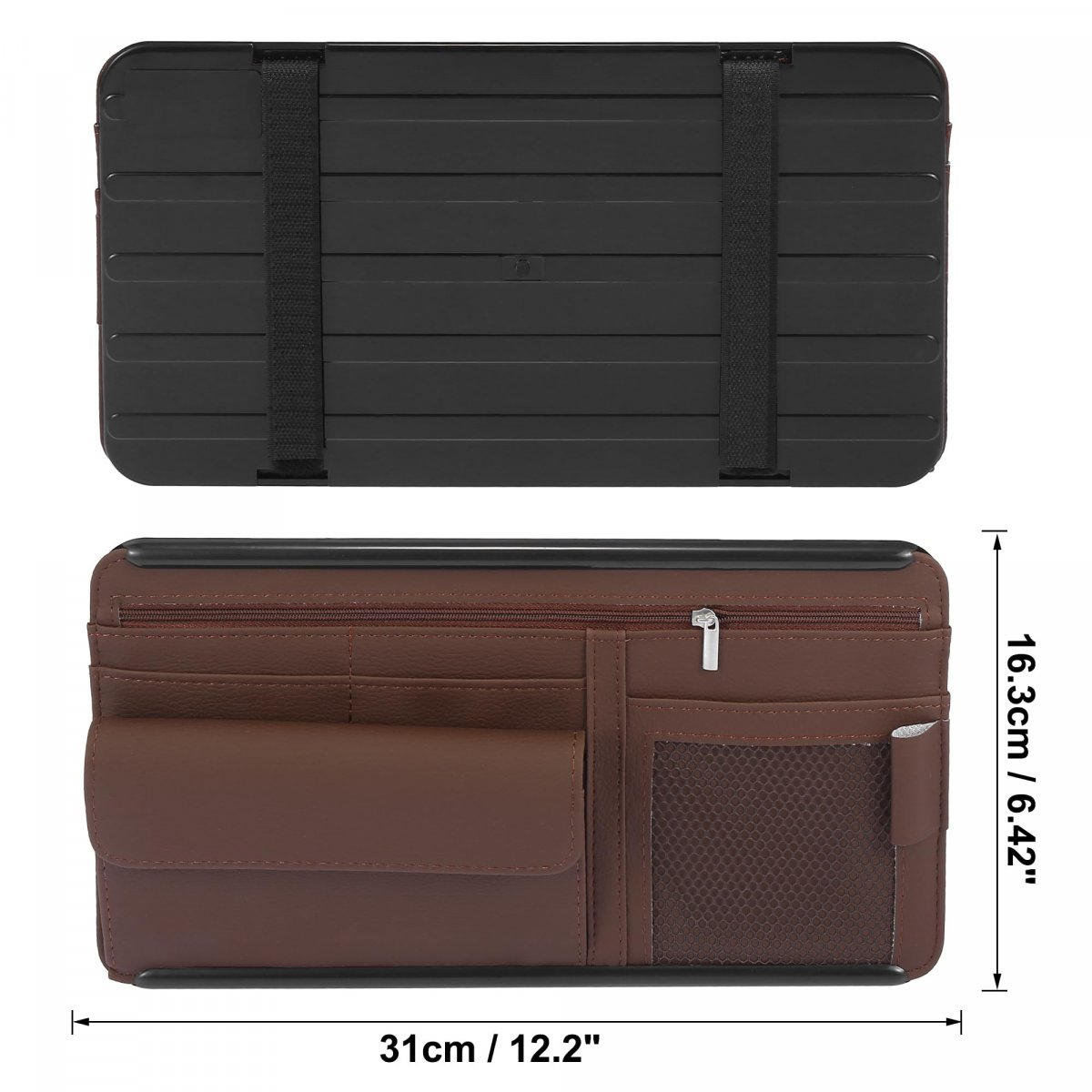 [Enough Storage Space] The sun visor organizer with sunglasses case, storage nets and zipper storage bag, can store some small items, such as flashlight, pens, pencils, small notepads, emergency rescue tools, cards, glasses, business card holders, etc, keeps your car clean and tidy.. [Good Quality Material] The car sun visor storage bag is made of PU Leather, durable, dustproof and easy to clean..