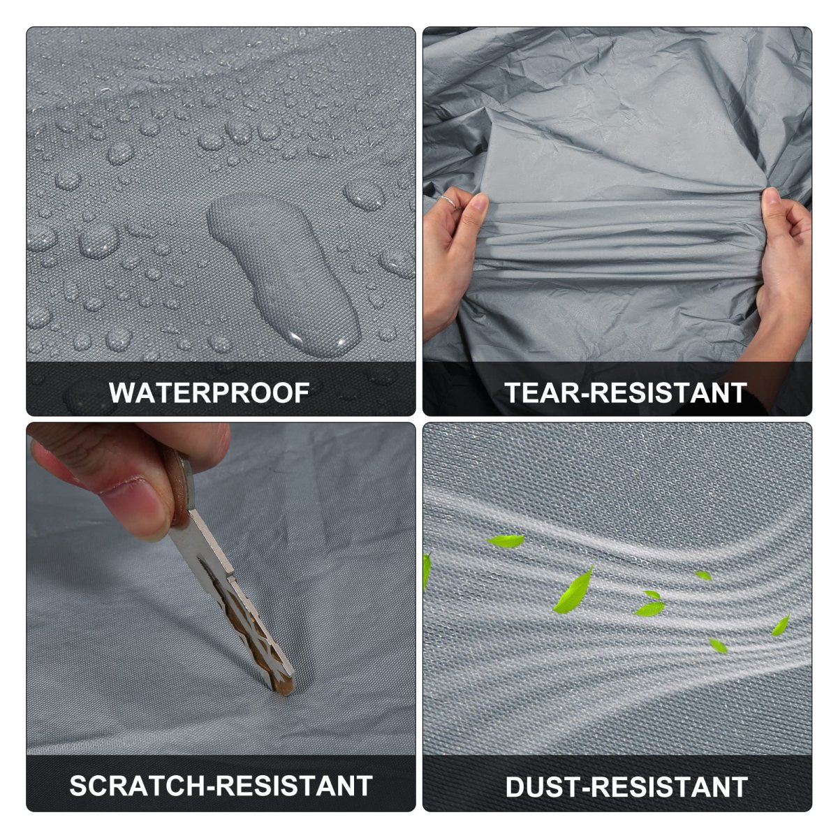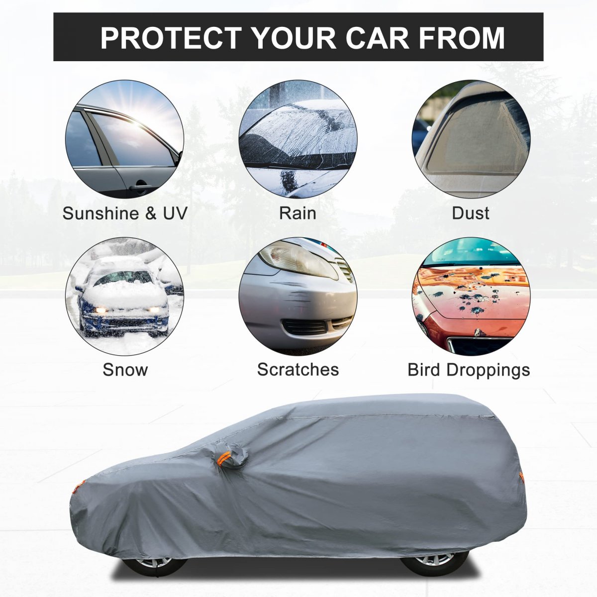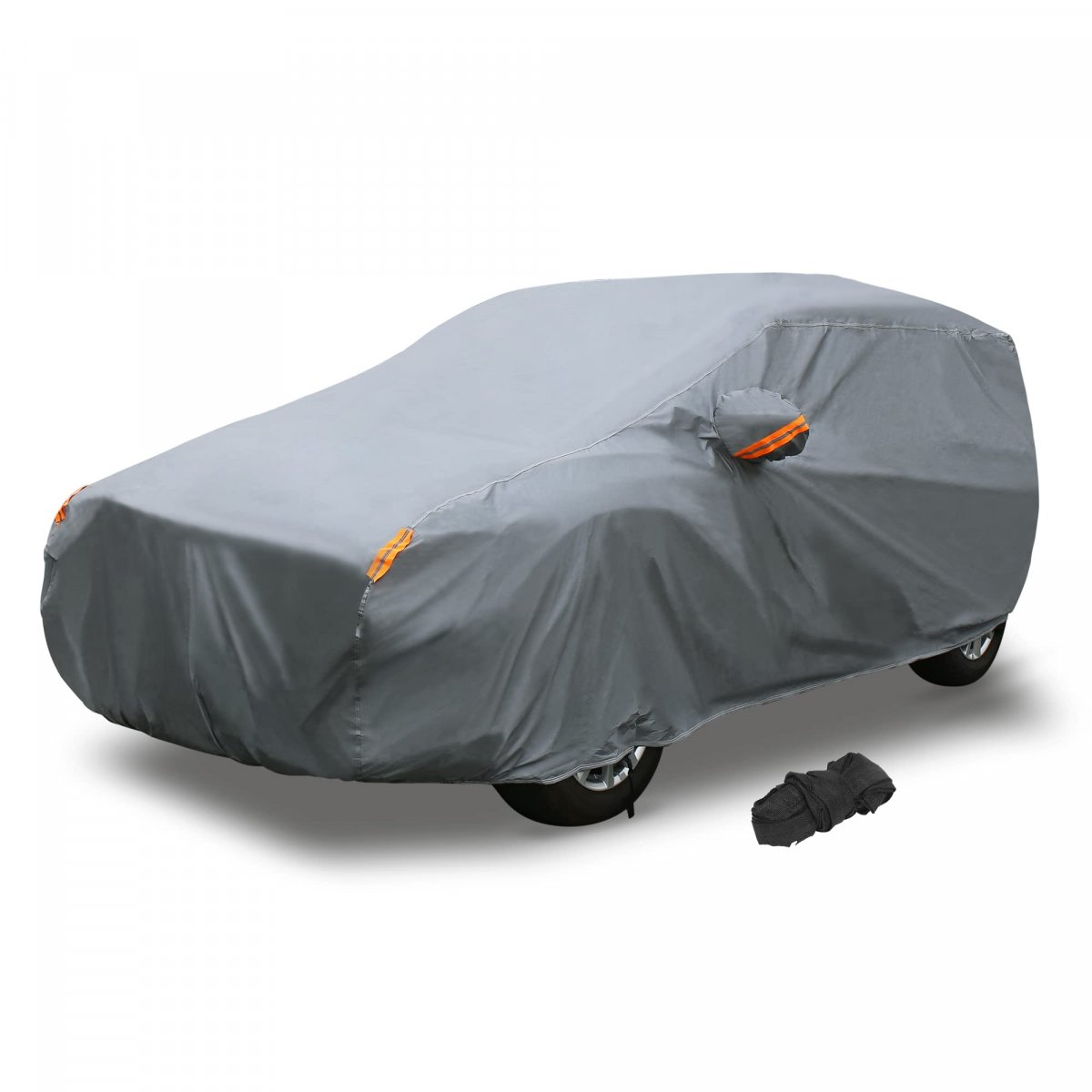 [Decent Material] The car cover is made of PEVA and spunlace cotton lining. The cover is waterproof, snowproof and sun resistant. It protects your car from hurt.. [Nice Design] The cove is designed with mirror pockets, reflective stripes and Windproof Ribbons. The mirror pocket fully covers the car, stripes remind people at night, ribbons fix the cover on the car body. Come with a portable storage bag to keep your cover.. [Dimension] YL, for SUV L (Up to Length: 16FT 191"). Dimension: 485x190x185cm / 191"x75"x73"(L*W*H).. [Full Protection] Protection from sun, bird droppings, tree sap, snow and ice, industrial pollutants, air dust, dirt, and sun light..Other fine products