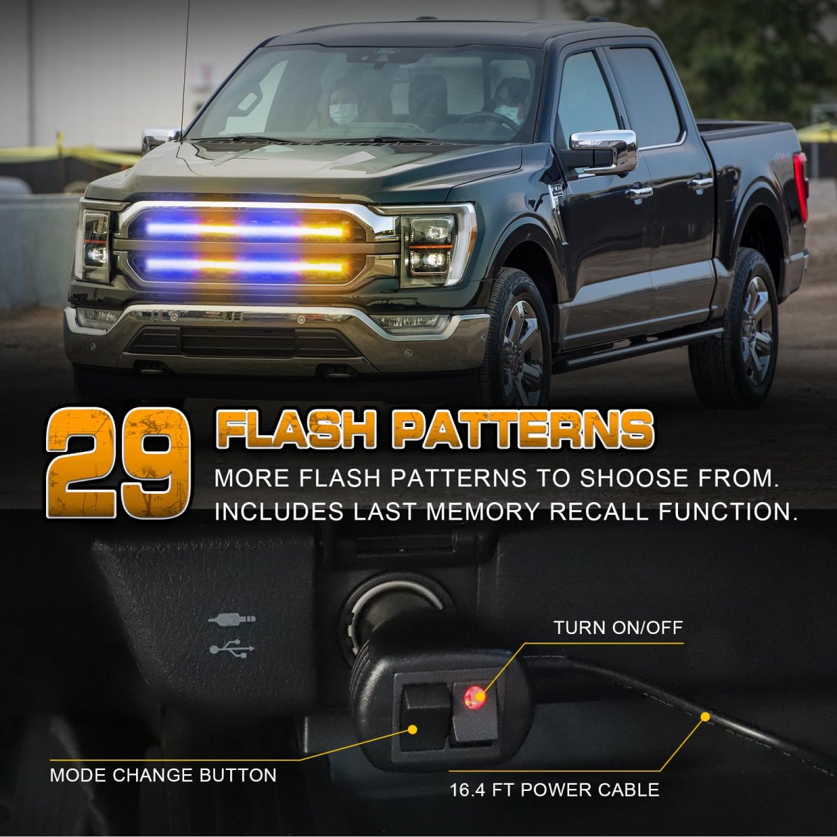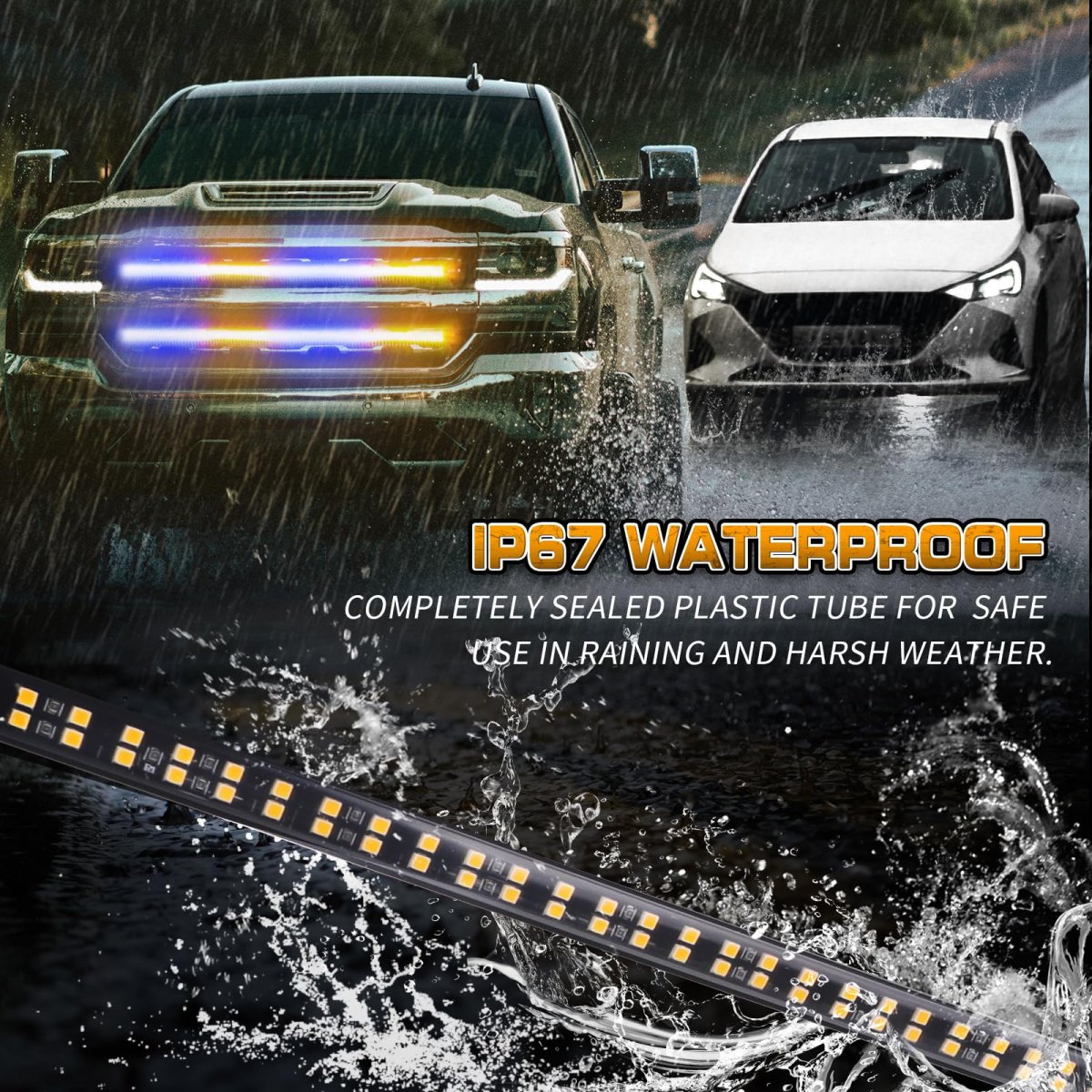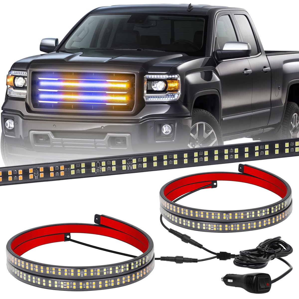 MAKE YOU STAND OUTThis 24 inch emergency grill lights are equipped with 288 high brightness LEDs. Even during the daytime, the truck lights are bright and noticeable to the driver and effective for any warnings and emergencies.. HIGH-QUALITYThis emergency firefighter lights are well-made and lightweight, low consumption, and a service life of 50,000 hours.The clear plastic tube is completely sealed for safe use in harsh weather. Whole led strobe lights strip is IP67 waterproof.. QUICK RESPONSEJust plug in the 12V cigarette lighter switch, and control the strobe mode you need through the cigarette lighter switch, with memory function. 26 different flashing patterns , very handy for late night calls, first responder, storm work or danger.. EASY TO INSTALLNo need to drill, just clean the mounted surface and peel and stick the emergency lights strip for installation. Strong adhesive and cable ties ensure stable installation. Even driving through lots of rain, highway speeds, potholes, the satety light can still stay on and work great..Other fine products