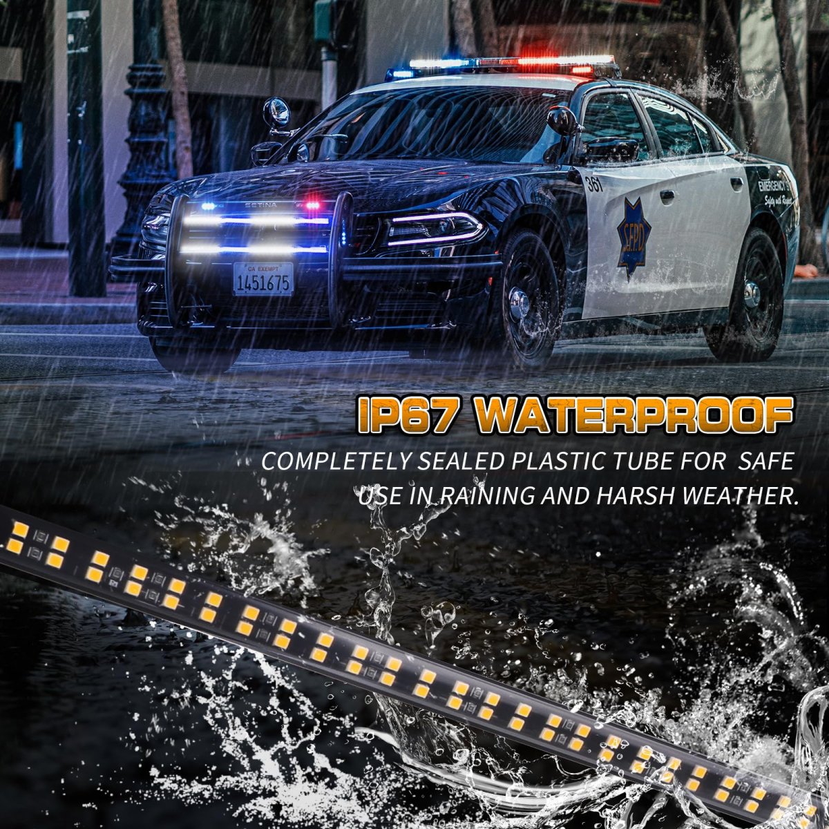 MAKE YOU STAND OUTThis 24 inch grill emergency lights are equipped with 288 high brightness LEDs. Even during the daytime, the truck lights are bright and noticeable to the driver and effective for any warnings and emergencies.. HIGH-QUALITYThis emergency firefighter lights are well-made and lightweight, low consumption, and a service life of 50,000 hours.The clear plastic tube is completely sealed for safe use in harsh weather. Whole led strobe lights strip is IP67 waterproof.. QUICK RESPONSEJust plug in the 12V cigarette lighter switch, and control the strobe mode you need through the cigarette lighter switch, with memory function. 26 different flashing patterns , very handy for late night calls, first responder, storm work or danger.. EASY TO INSTALLNo need to drill, just clean the mounted surface and peel and stick the emergency lights strip for installation. Strong adhesive and cable ties ensure stable installation. Even driving through lots of rain, highway speeds, potholes, the satety light can still stay on and work great..Other fine products