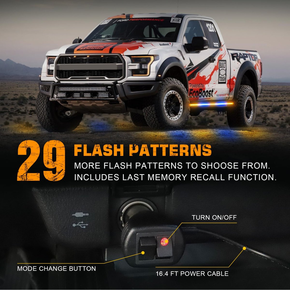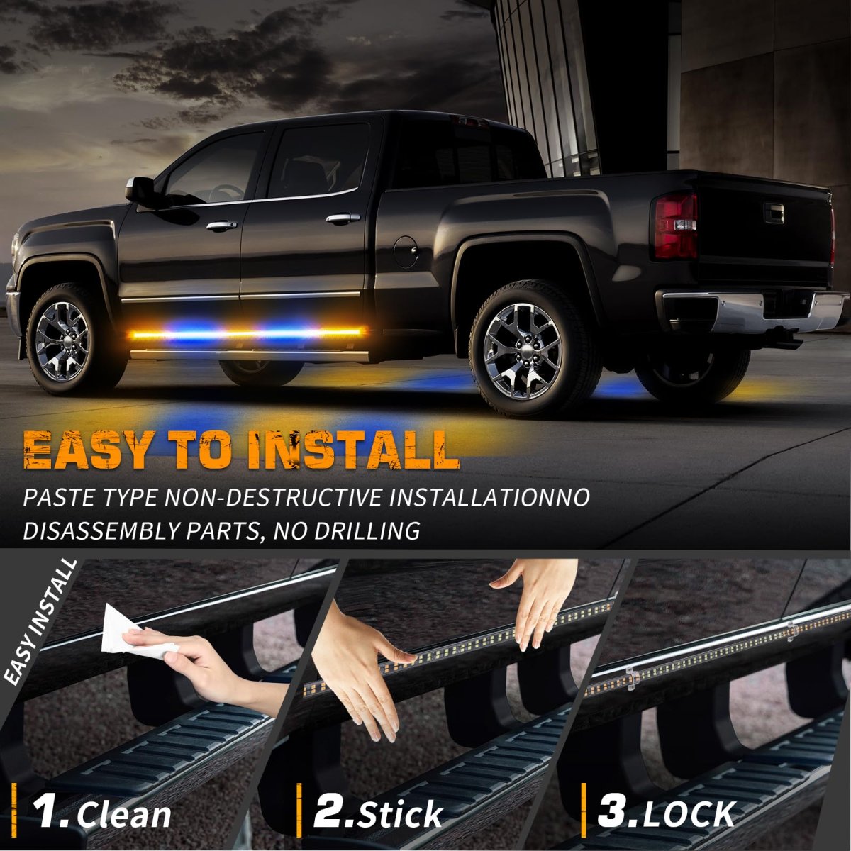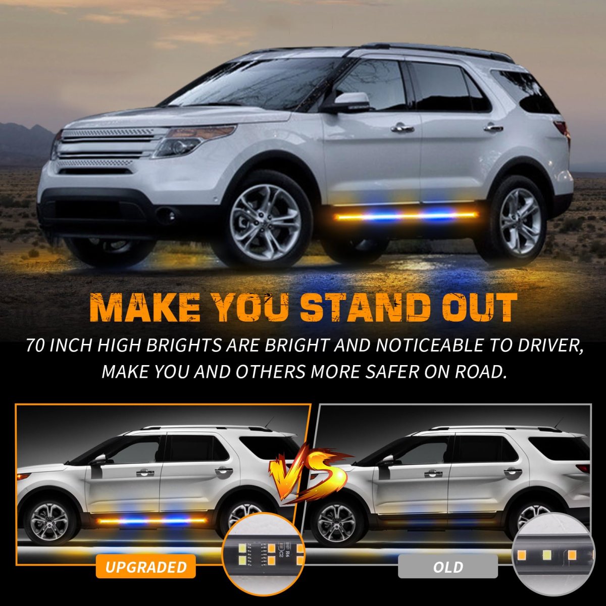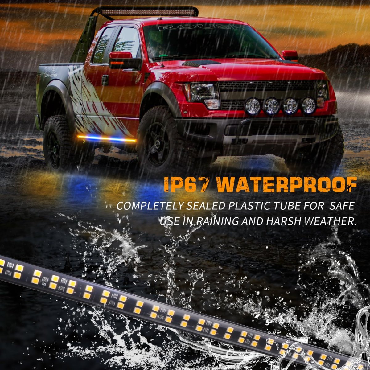 MAKE YOU STAND OUTThis upgraded 2 in 1 amber and blue strobe light strip comes with 720 high brightness LEDs. Even during the day, the light strip are bright and noticeable to the driver. Makes the vehicle much more noticeable and safer on the road.. HIGH-QUALITYThis truck strobe lights strip is well-made and lightweight, low consumption, and a service life of 50,000 hours.The clear plastic flexible tube is completely sealed for safe use in harsh weather. Whole led strobe lights strip is IP67 waterproof.. QUICK RESPONSEPLUG AND PLAY. Control the strobe patterns through the 12V cigarette lighter switch. 29 different flashing patterns and last memory recall function, very handy for late night calls, first responder, storm work or danger.. EASY TO INSTALLJust clean the mounted surface, peel and stick the side step lights for installation. Strong adhesive and clear locks ensure stable installation. Even driving through lots of rain, highway speeds, potholes, the safety light can still stay on and work great.. WIDELY APPLICATIONThe 2x 60 inch amber and blue running board lights widely used for Hazard Warning, Law Enforcement, First Responder, emergency vehicles and tow trucks, construction vehicles, police, EMS, security, snow plow, jeep, postal workers, etc..Other fine products