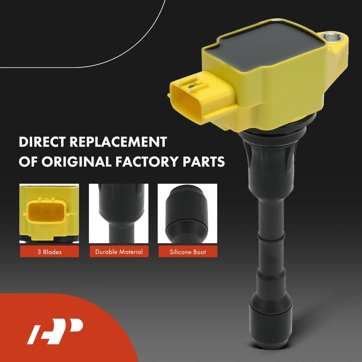 [Vehicle Fitment]: Compatible with Infiniti EX35 2008-2012 V6 3.5L, FX35 2009-2012 V6 3.5L, G25 2011-2012 V6 3.5L, G35 2007-2008 V6 3.5L, JX35 2013 V6 3.5L, M35 2009-2010 V6 3.5L, M35h 2012-2013 V6 3.5L, Q50/Q70 2014-2018 V6 3.5L, QX60 2014-2020/2022-2023 V6 3.5L; Compatible with Nissan 350Z 2007-2009 V6 3.5L, Altima 2007-2018 V6 3.5L, Maxima 2009-2014/2016-2020 V6 3.5L, Murano 2009-2020 V6 3.5L, Pathfinder 2013-2020 V6 3.5L, Quest 2011-2017 V6 3.5L. [Reference Number]: UF550, UF-550, 22448JA10A, 22448JA10C, 22448JA11C, 22448JA12D. [Specifications]: Coil Terminal Quantity: 2; Terminal Type: Blade; Mount Type: Bolt On; Mounting Location: Valve Cover; Primary Resistance(ohms): 0.7210%(0.65-0.79); Secondary Resistance(K): 14.6210(13.16-16.08); Spark Plug Material: Iridium+Nickel; Gap Size(IN): 1.0-1.1; Thread Diameter(MM): 12; Installation Torque(N): 15-20N. [Iridium Spark Plug]: Iridium is a type of refined alloy which is highly suitable to be used as the materials of the central electrode in a spark plug. It extends the life of the spark plug nearly threefold, ensures a more stable idle speed of the engine, and delivers a super performance to the engine with improved fuel efficiency, reduced emissions and faster starting up.Other fine products