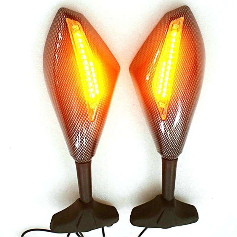 Shell Color: Carbon Look (Not real carbon fibre) , Light color is AMBER , Light lens color : choose clear. Material: High impact ABS shell ; LED turn signals. Quantity: 1 pair Mirrors (Left & Right Sides), Hardwares as Picture. Glass mirror measures 3 1/3" x 5 1/2", stem length: 4", Mirror (glass) Material: Acrylic (provides clear view and not easy to crack or break).Other fine products